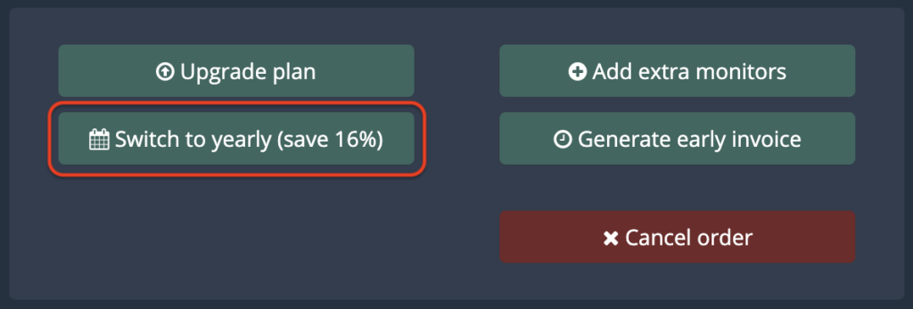 You can switch from monthly to yearly billing to get the 16% yearly discount on your order, or switch from yearly to monthly billing, as you choose.