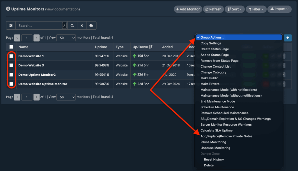 You can now use our Group Actions to modify the Private Notes of multiple uptime monitors at once, in bulk.