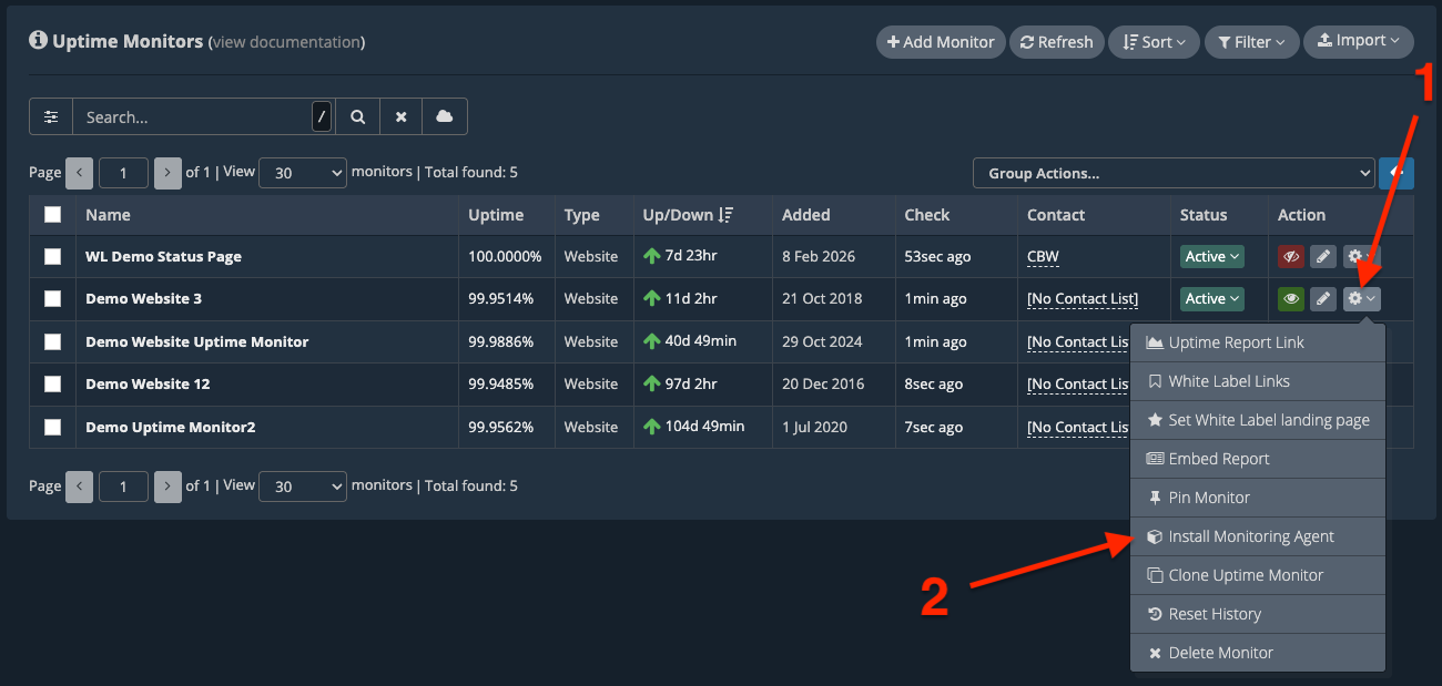 Now, locate the Uptime Monitor you wish to attach this Server Monitor to and go to its “Action” column, click on the cogwheel drop-down actions button, and select “Install Monitoring Agent”.