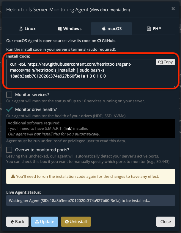 On the “macOS” tab, you’ll have the macOS installation code and configurable options. Make sure to select all configurable options before copying and pasting the installation code into your macOS terminal, as the installation code will change based on your selections.