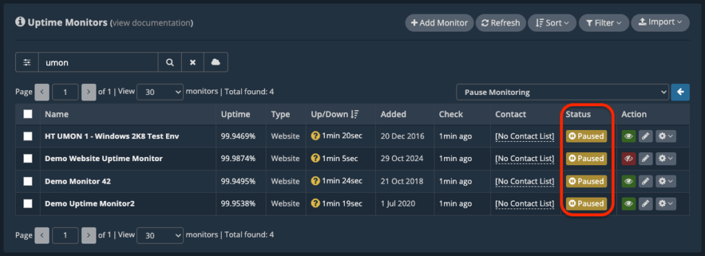 To unpause your paused Uptime Monitors, repeat the same process but select “Unpause Monitoring” instead.