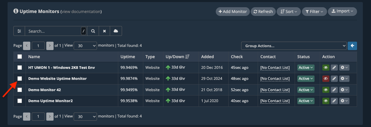 Select one or more Uptime Monitors by checking their respective checkboxes to the left in the monitors table.