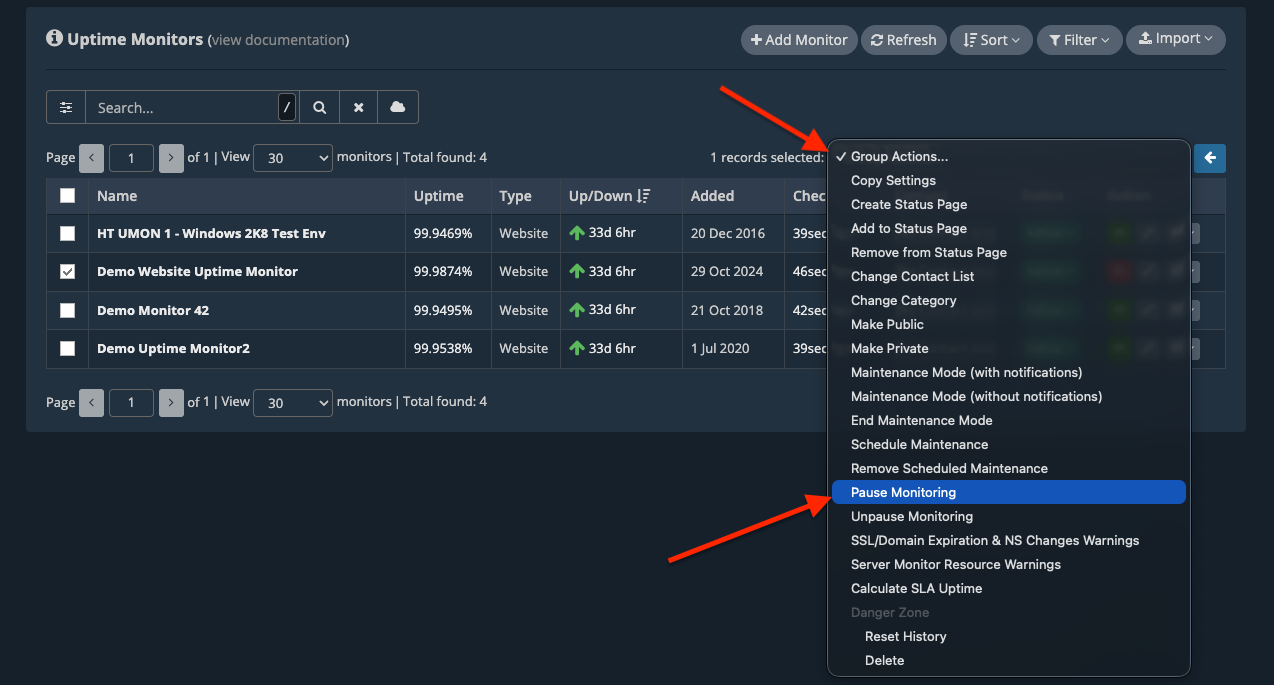 Then, select “Pause Monitoring” from the “Group Actions…” select options.
