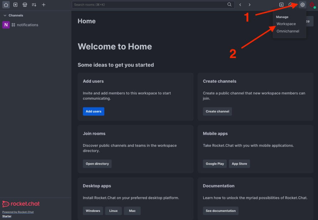 1) Go to your RocketChat workspace settings from the top right side cogwheel: