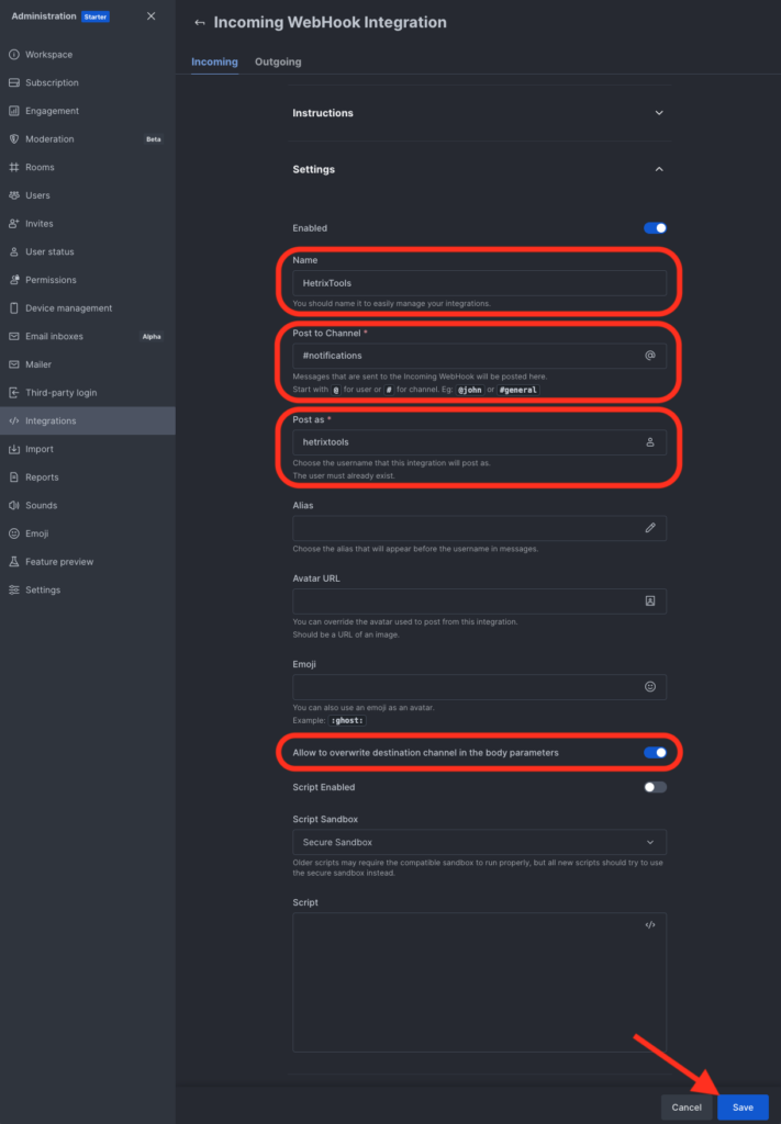 4) Now, be sure that ‘Incoming’ is selected (should be selected by default), fill out the integration details, and click on the ‘Save’ button towards the bottom: