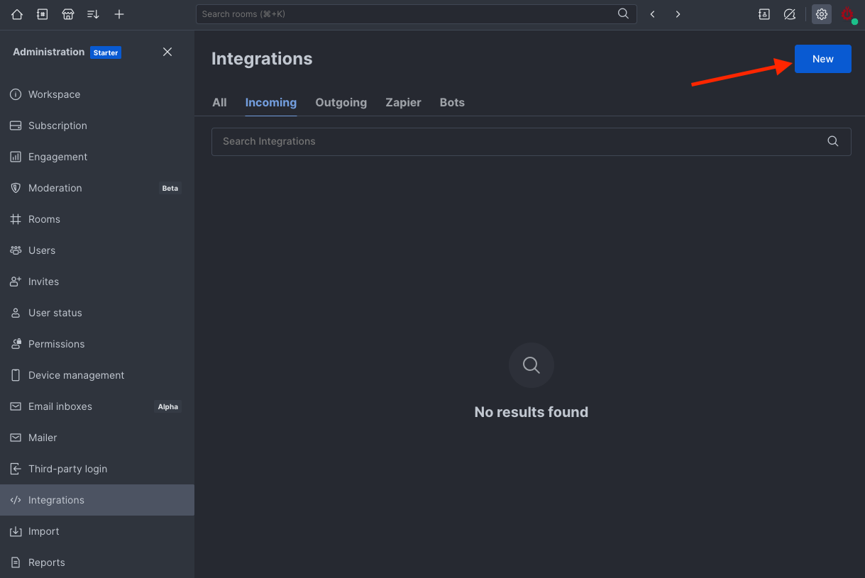 3) On the ‘Integrations’ page, click on the ‘New’ button on the top right side of the page: