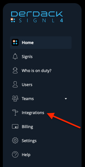 Start by heading to your SIGNL4 dashboard, and click on the “Integrations” link from the side menu: