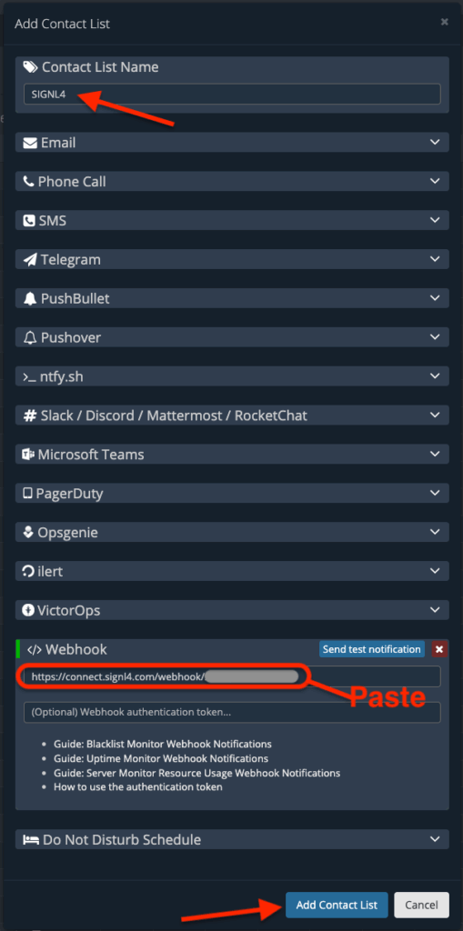 Once the new Contact List is created, you can assign it to your Uptime Monitors or Blacklist Monitors to receive our notifications in your SIGNL4 account.